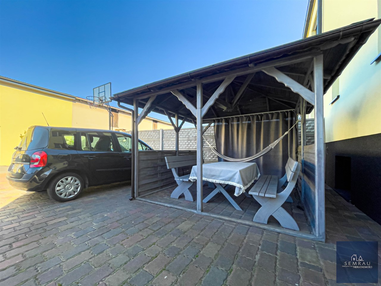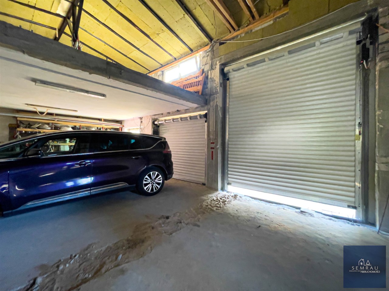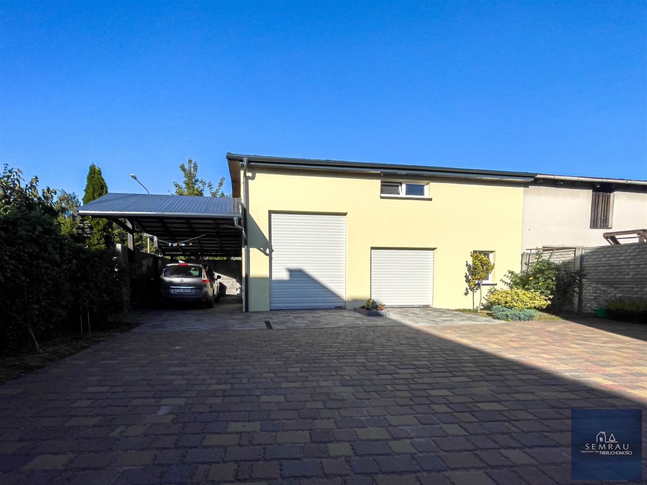 W tylnej części działki garaż dwustanowiskowy murowany o powierzchni 53 m2 z bramami na pilota, z których większa 3,30 m x 2,70 m przystosowana jest do busów. Do dyspozycji także poddasze o pow. 32 m2 oraz zadaszona wiata o pow. 22 m2. Całość podwórka wyłożona kostką brukową.