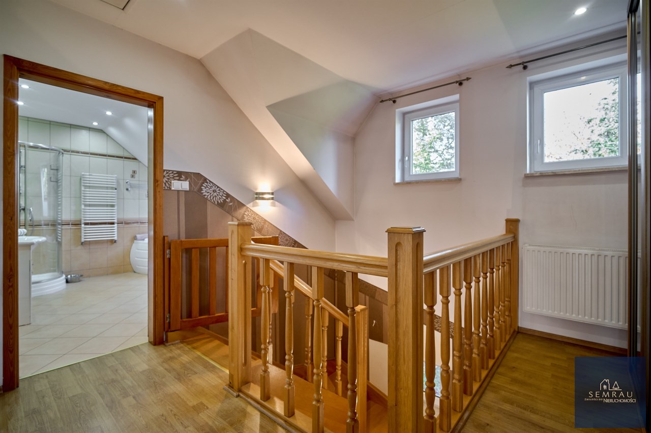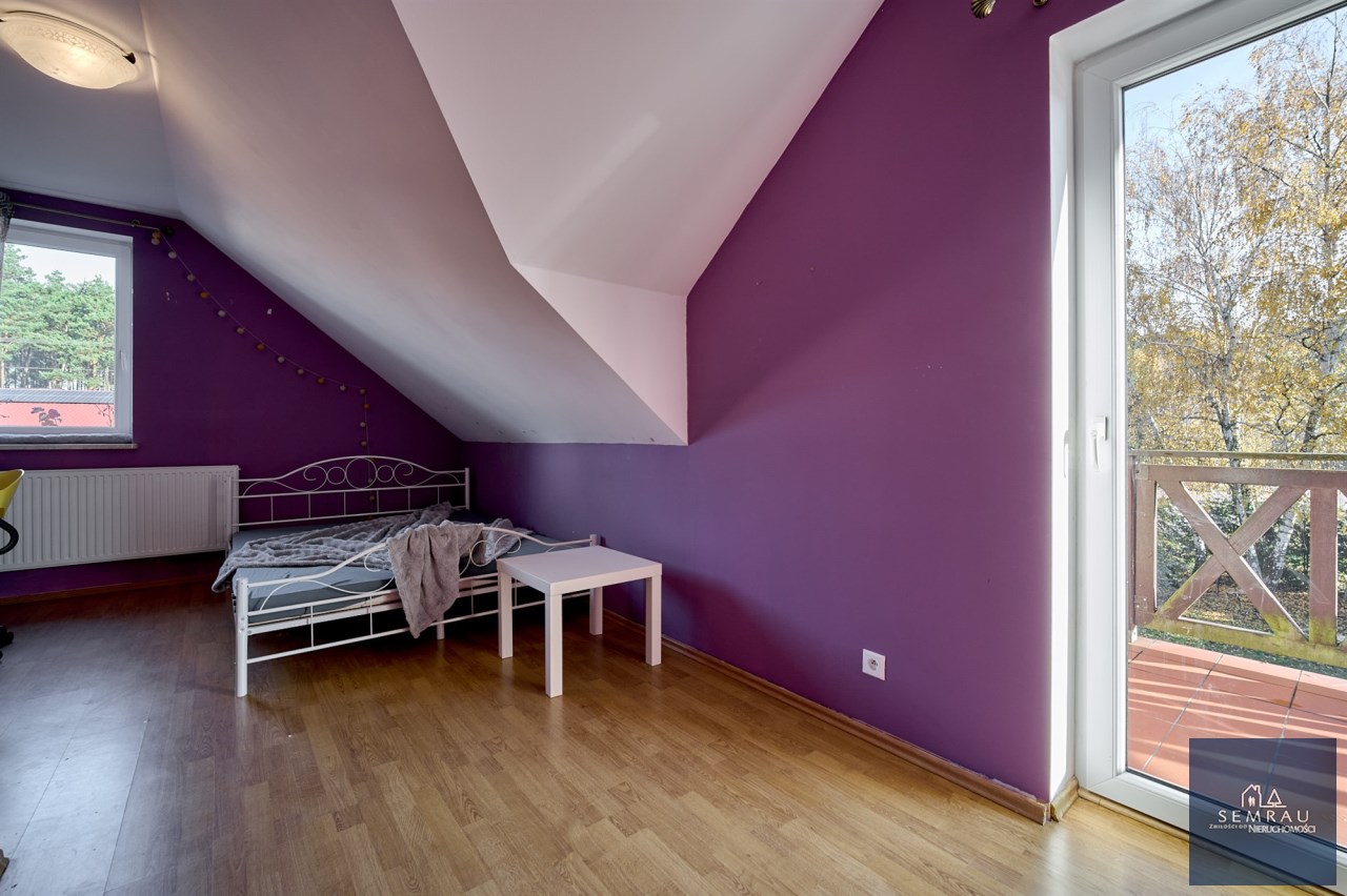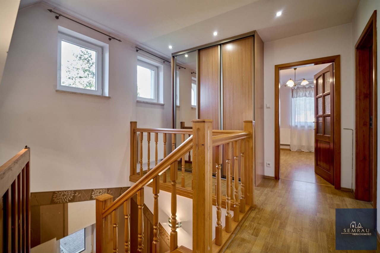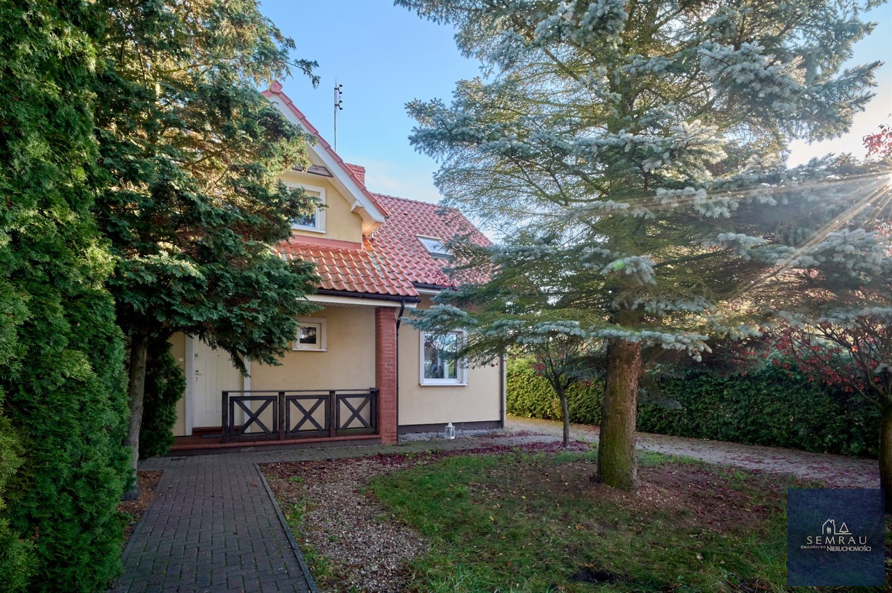 Dom oferuje przemyślany, niezwykle czytelny podział na strefy: część dzienna na parterze z przestronnym salonem oraz praktyczną kuchnią, a także strefa prywatna na poddaszu — trzy komfortowe sypialnie oraz duża łazienka tworzą idealne miejsce wypoczynku.