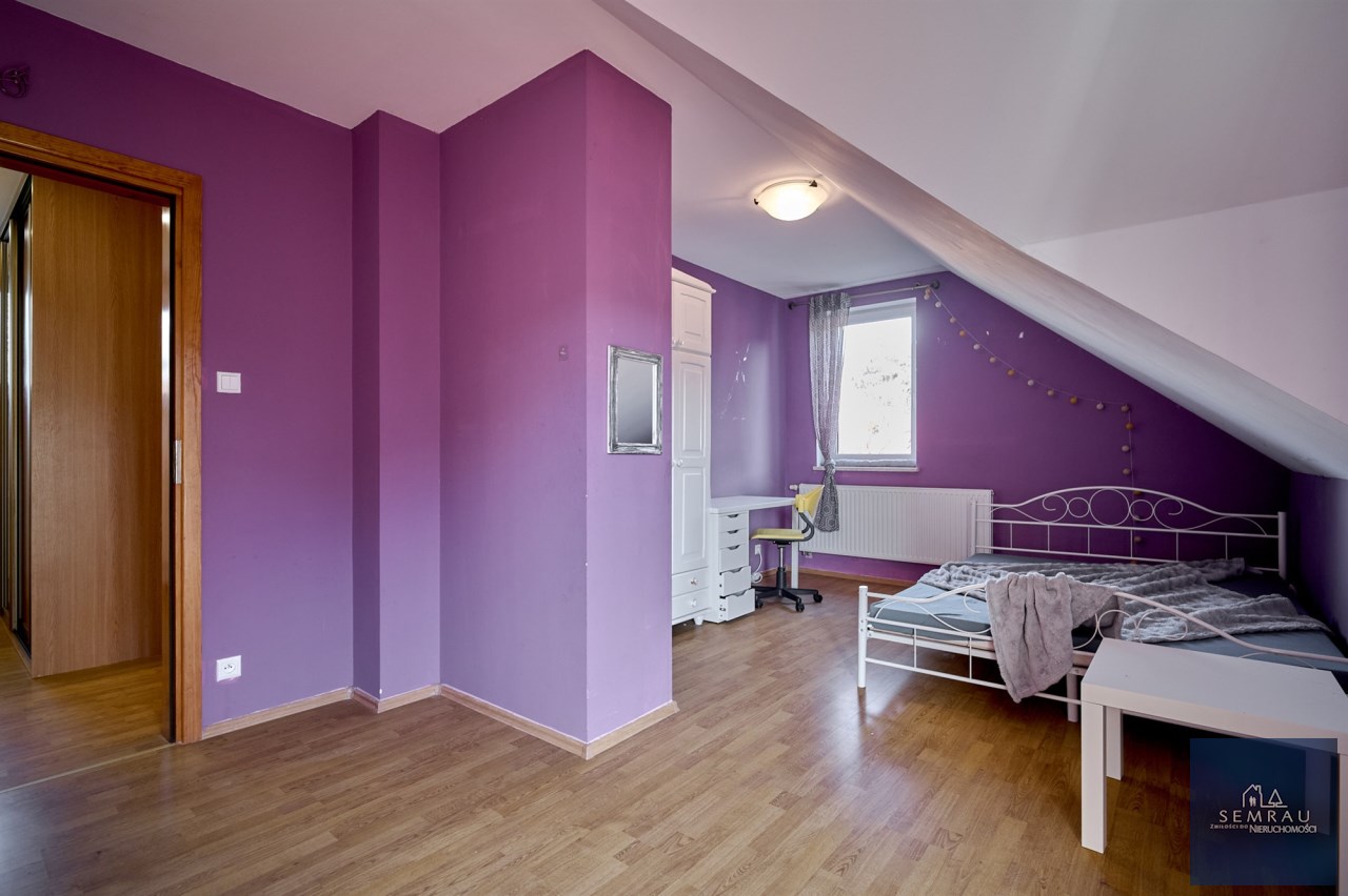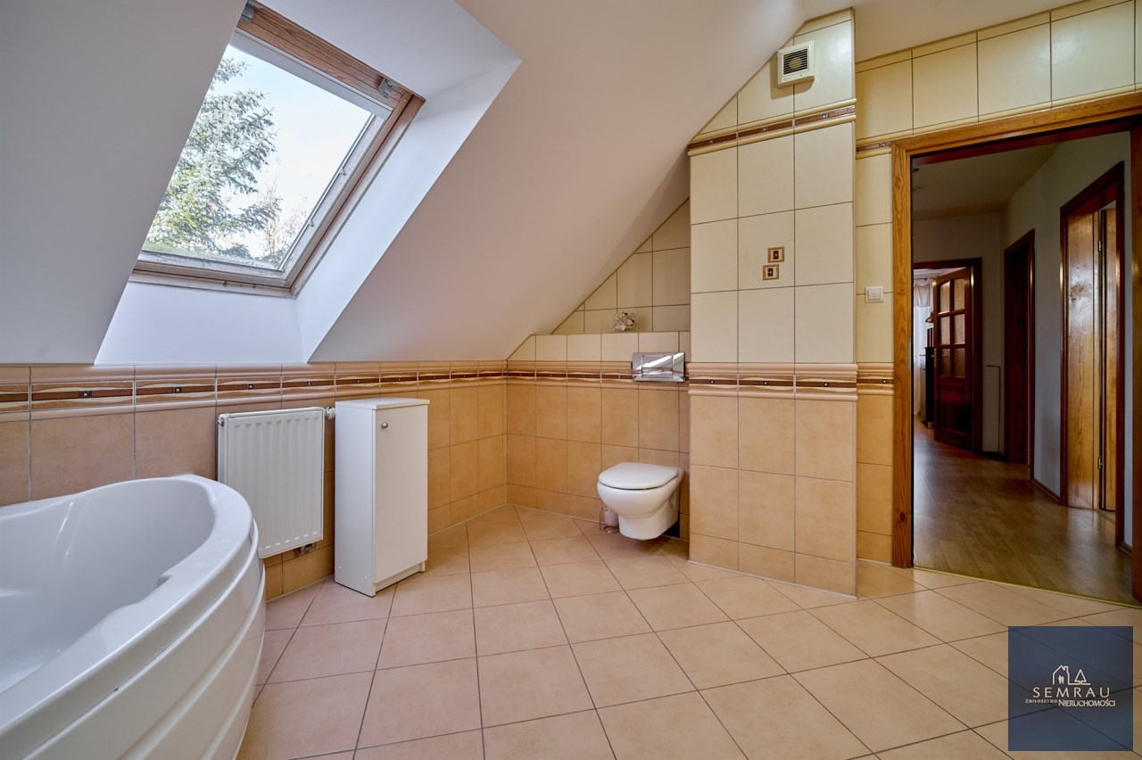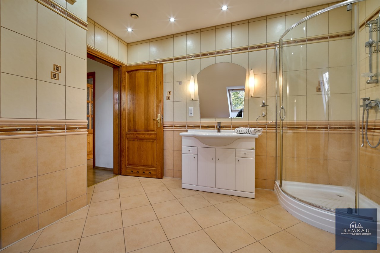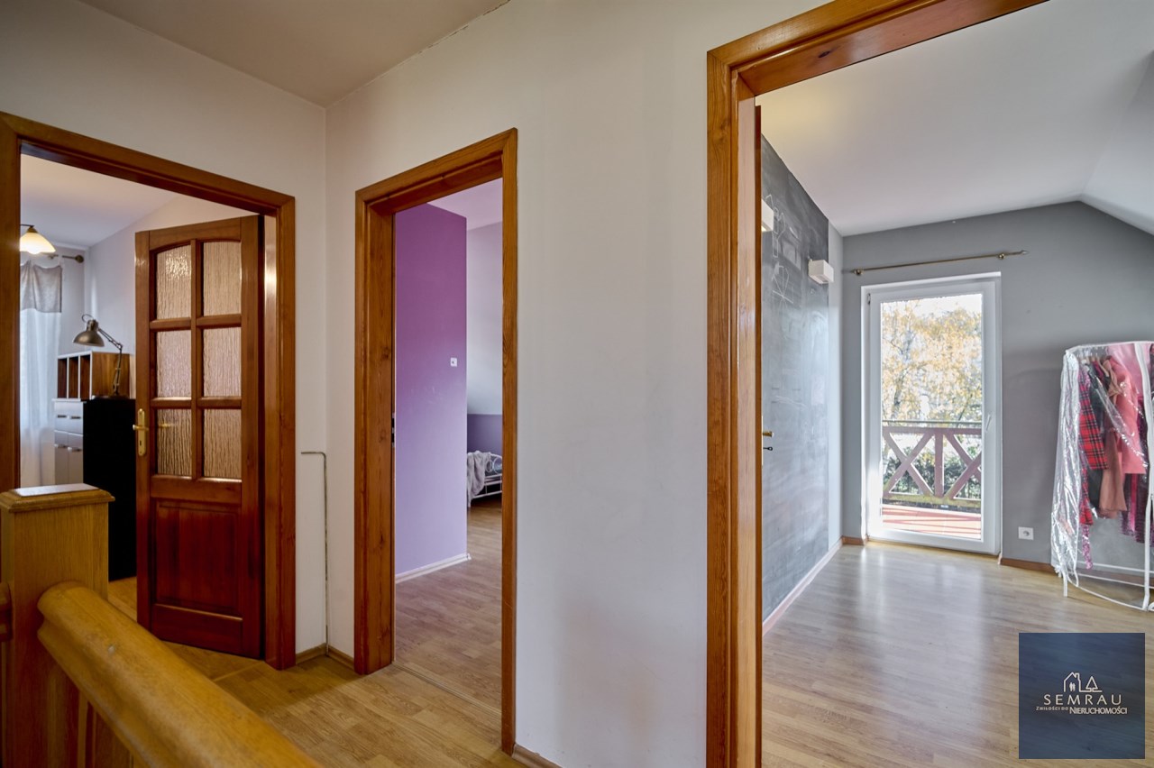 Dom oferuje przemyślany, niezwykle czytelny podział na strefy: część dzienna na parterze z przestronnym salonem oraz praktyczną kuchnią, a także strefa prywatna na poddaszu — trzy komfortowe sypialnie oraz duża łazienka tworzą idealne miejsce wypoczynku.