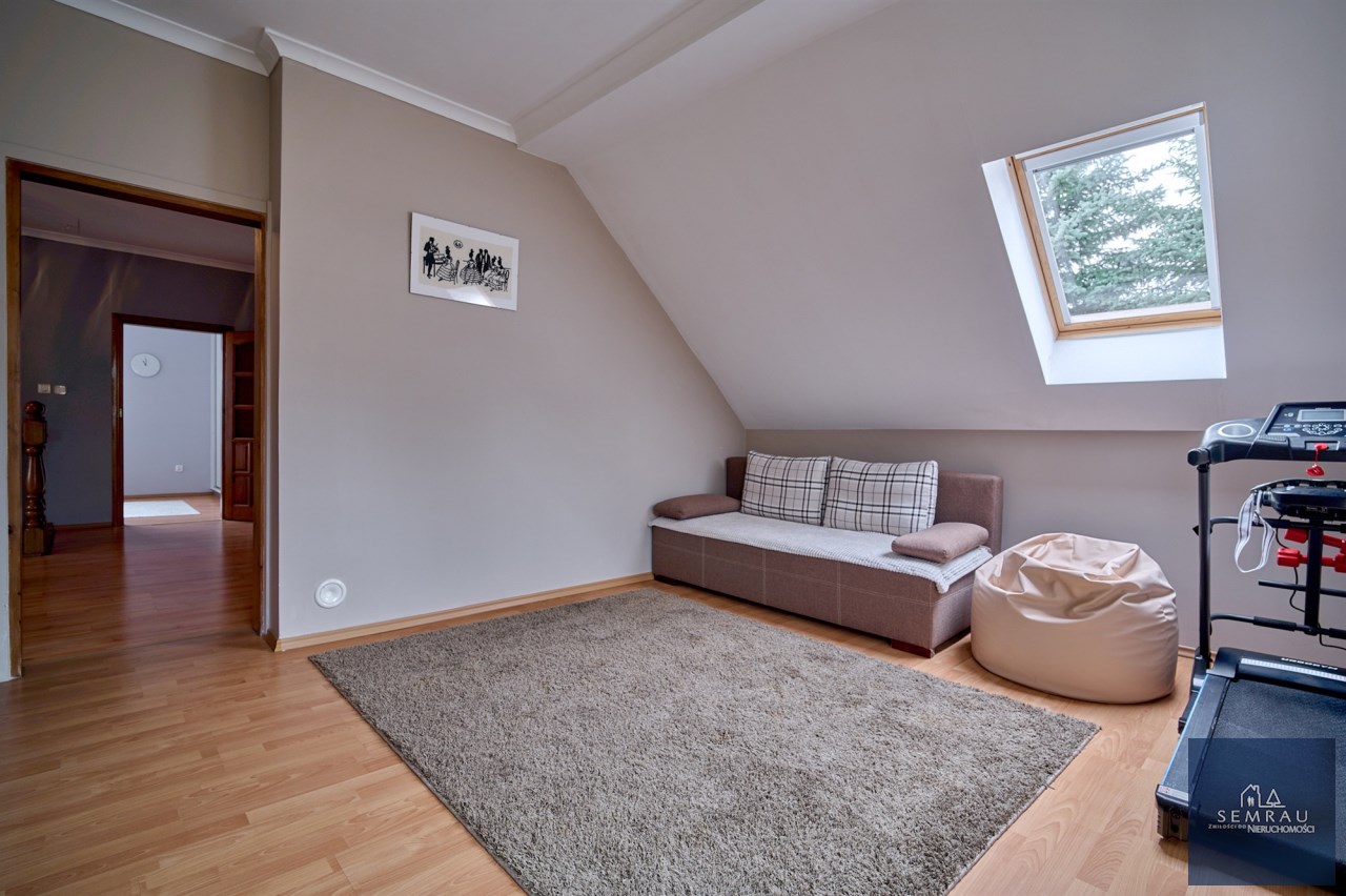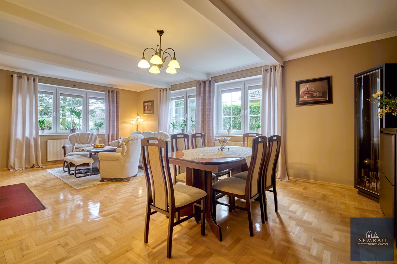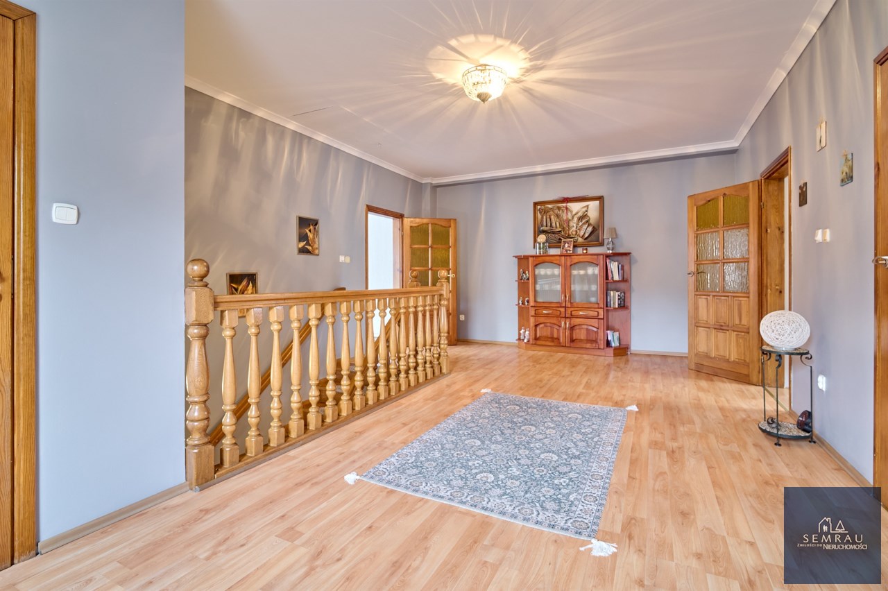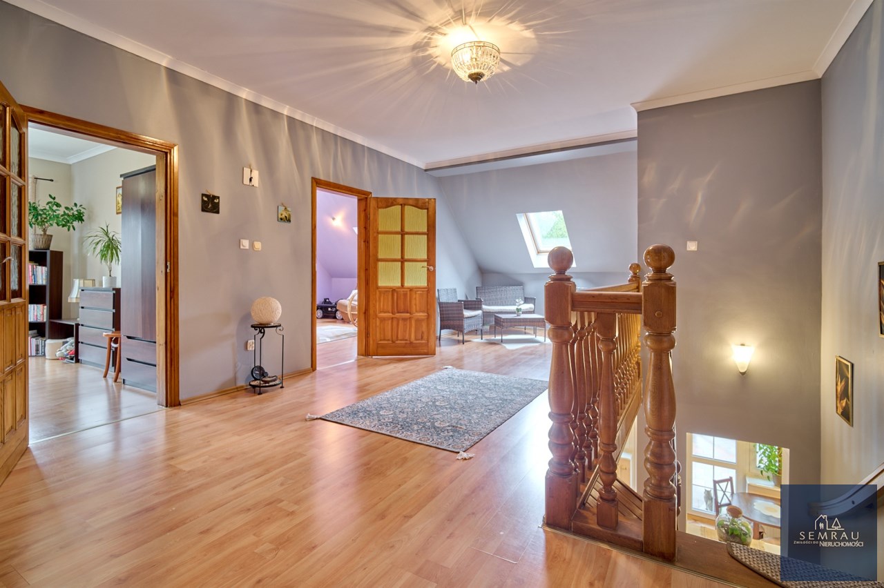 Funkcjonalny układ pomieszczeń z wyraźnym podziałem na strefę dzienną i prywatną – łącznie 5 pokoi, w tym duża sypialnia oraz gabinet, przestronna kuchnia z jadalnią, 2 łazienki oraz dodatkowa toaleta.