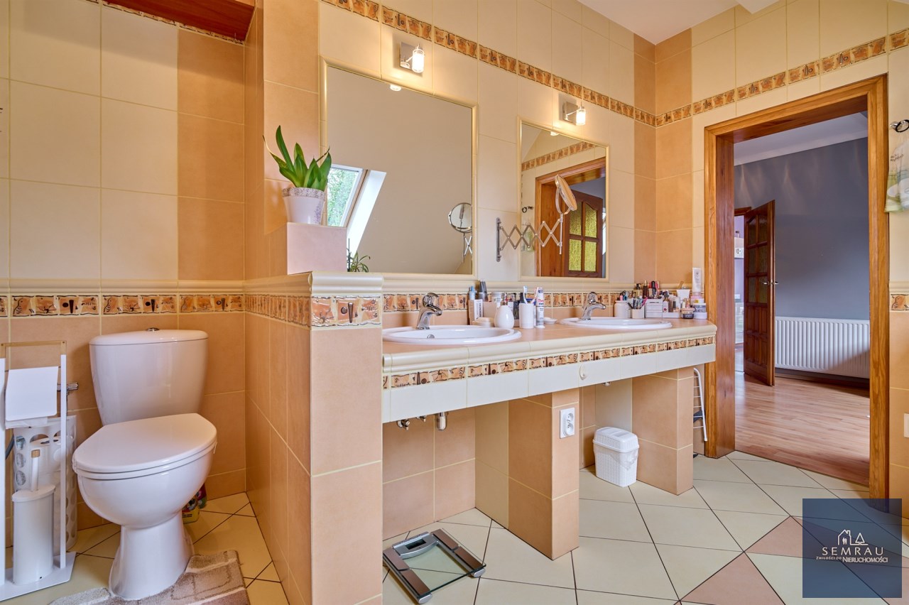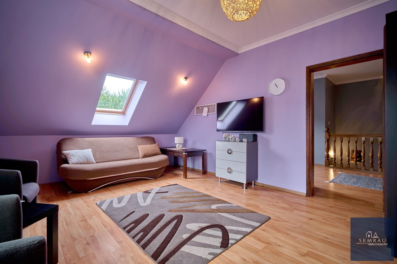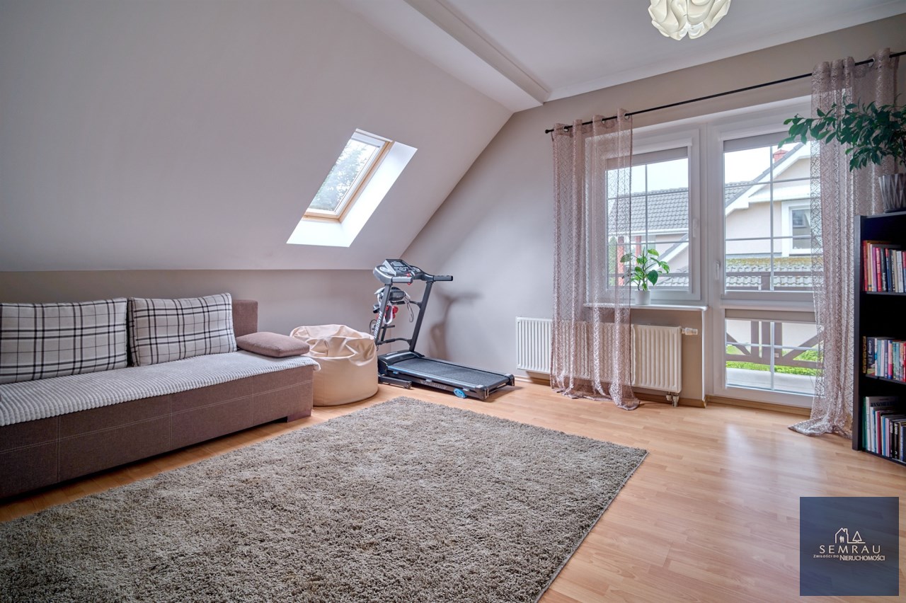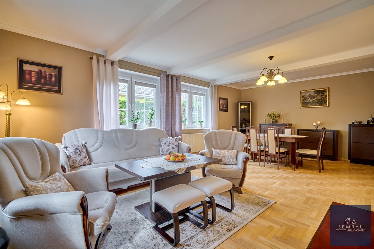 Funkcjonalny układ pomieszczeń z wyraźnym podziałem na strefę dzienną i prywatną – łącznie 5 pokoi, w tym duża sypialnia oraz gabinet, przestronna kuchnia z jadalnią, 2 łazienki oraz dodatkowa toaleta.