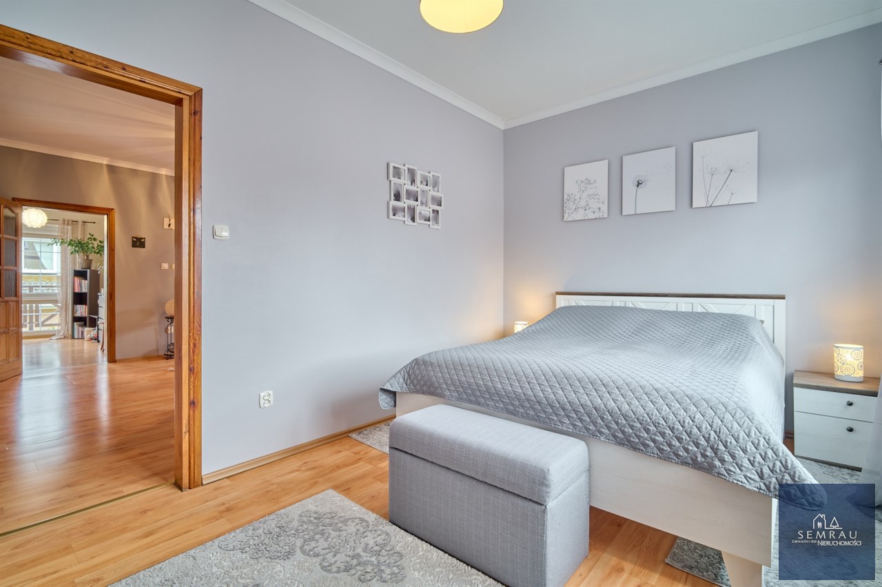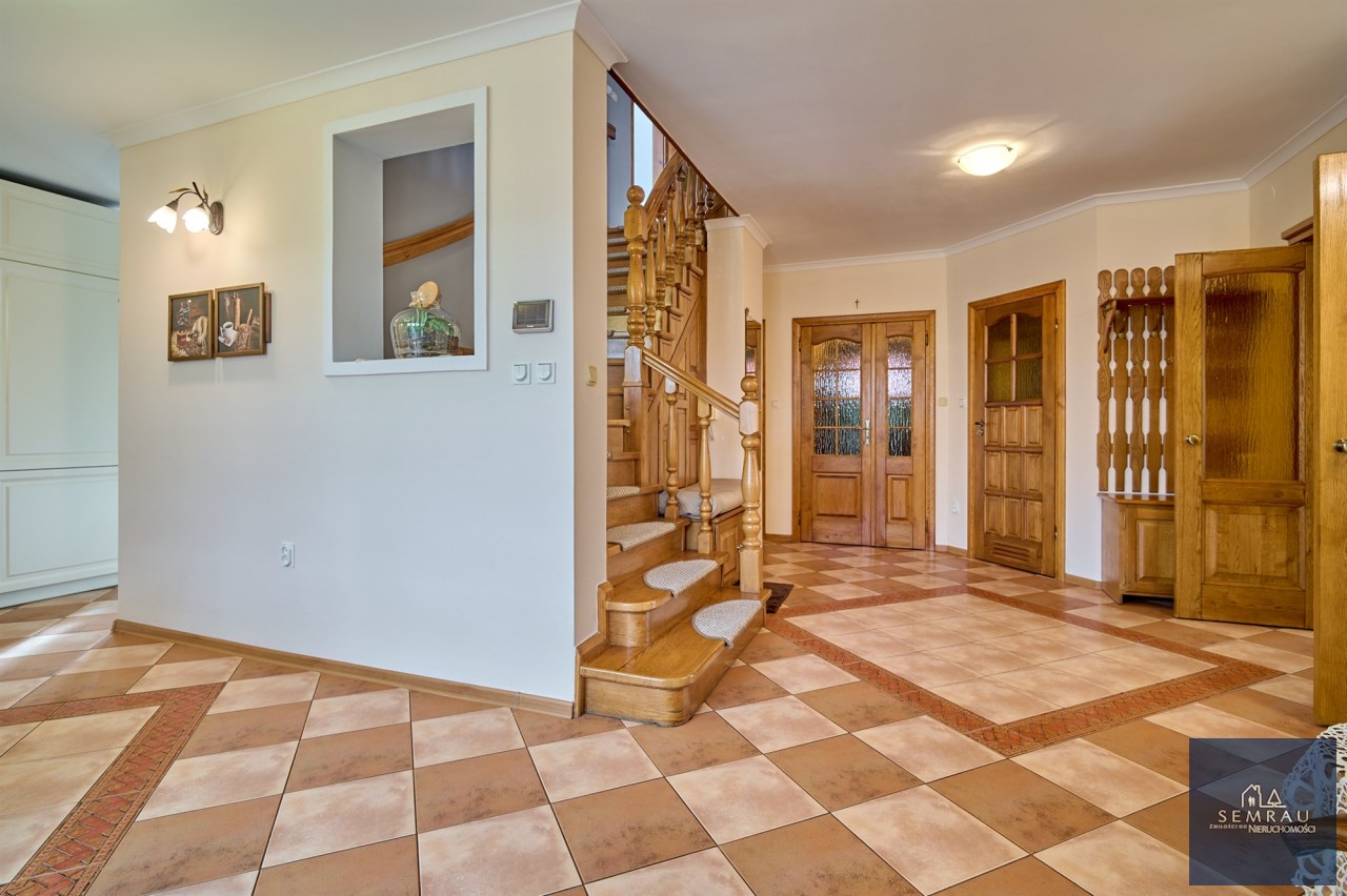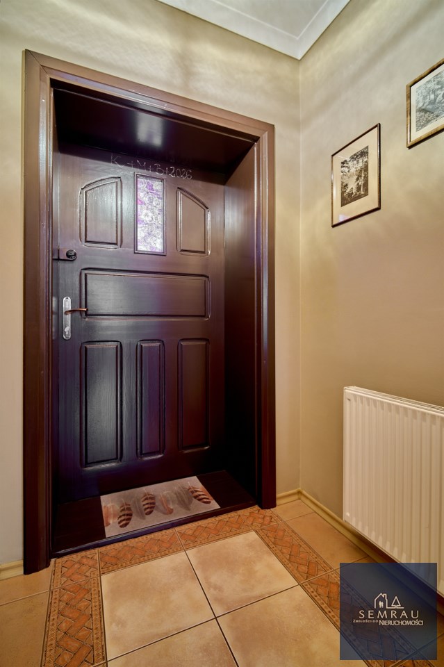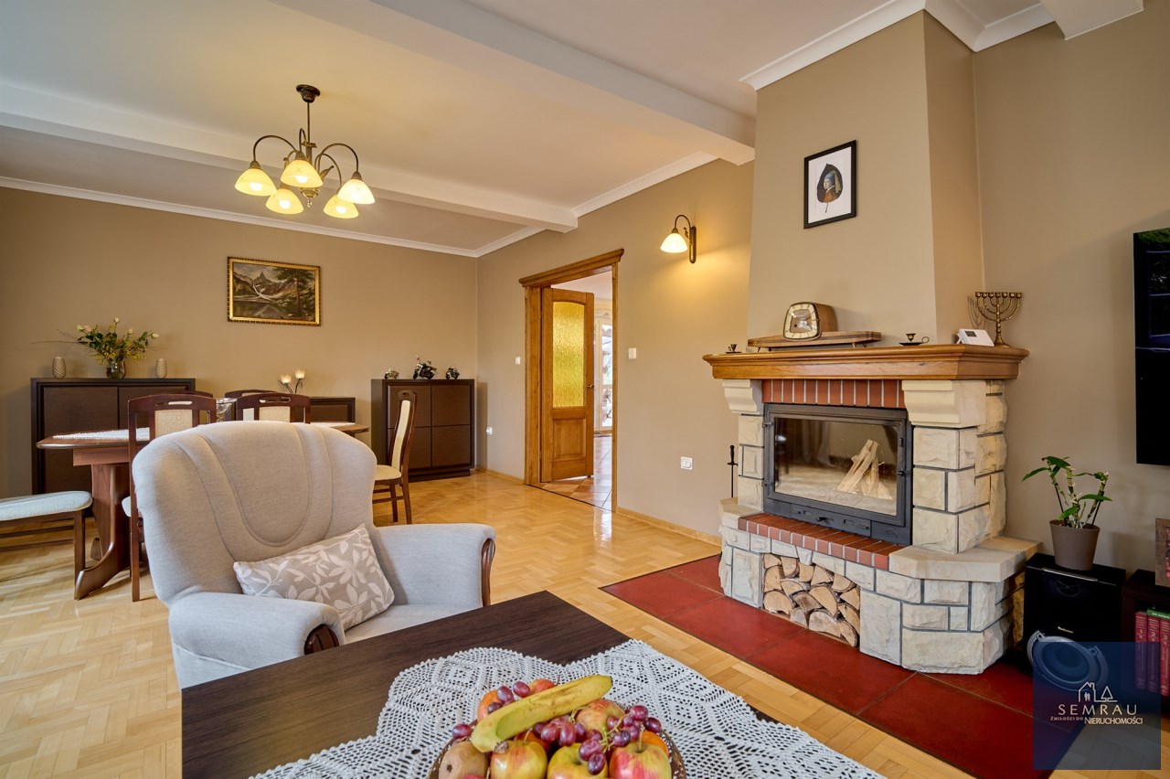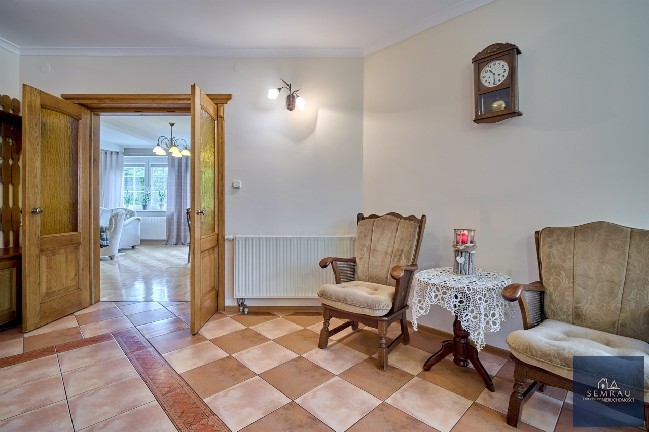 Funkcjonalny układ pomieszczeń z wyraźnym podziałem na strefę dzienną i prywatną – łącznie 5 pokoi, w tym duża sypialnia oraz gabinet, przestronna kuchnia z jadalnią, 2 łazienki oraz dodatkowa toaleta.
