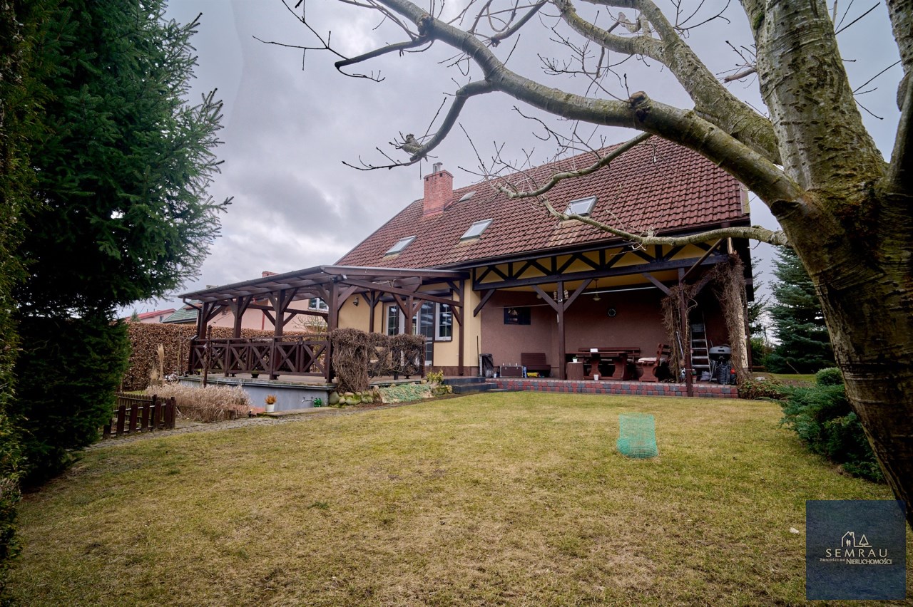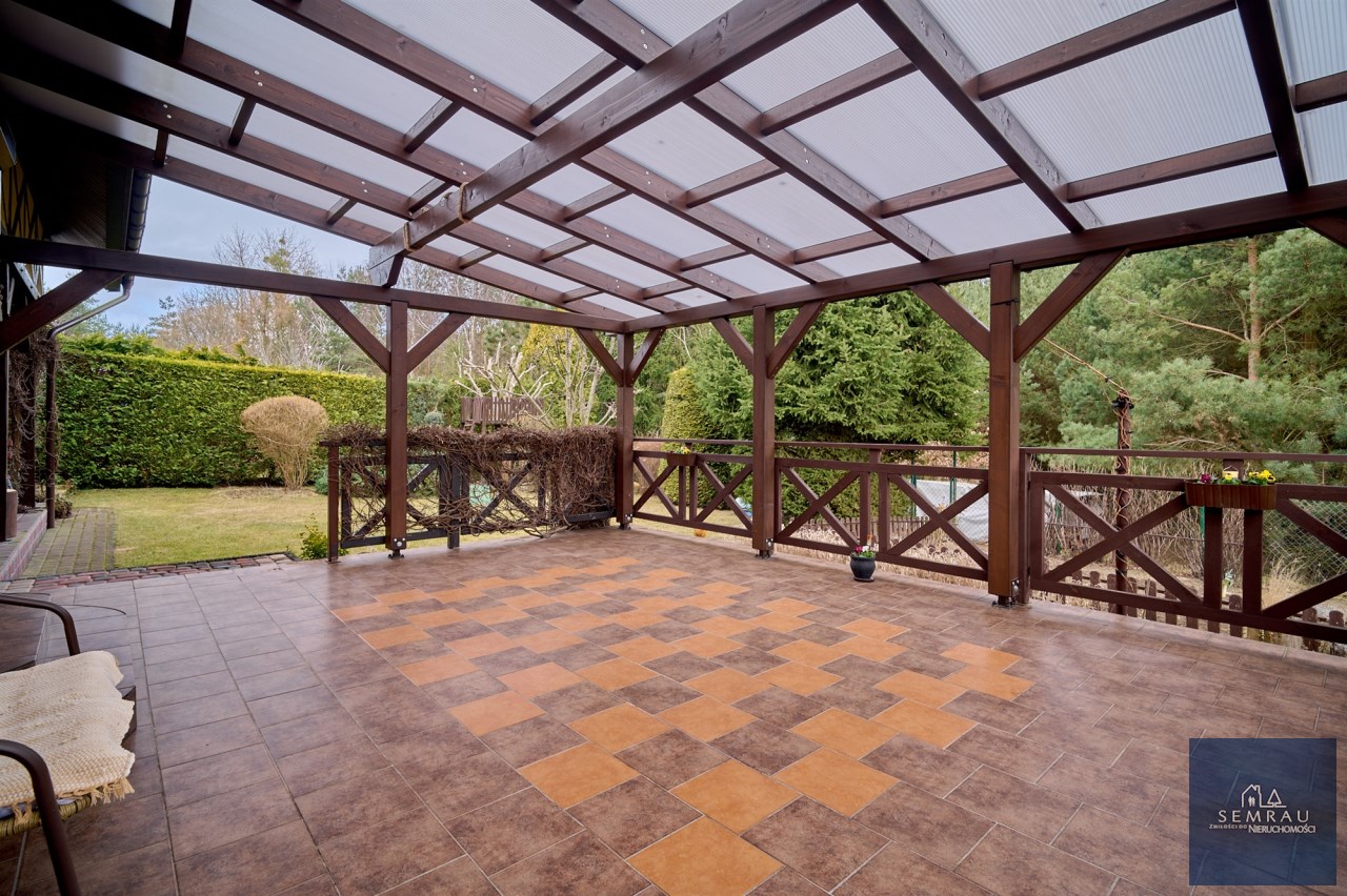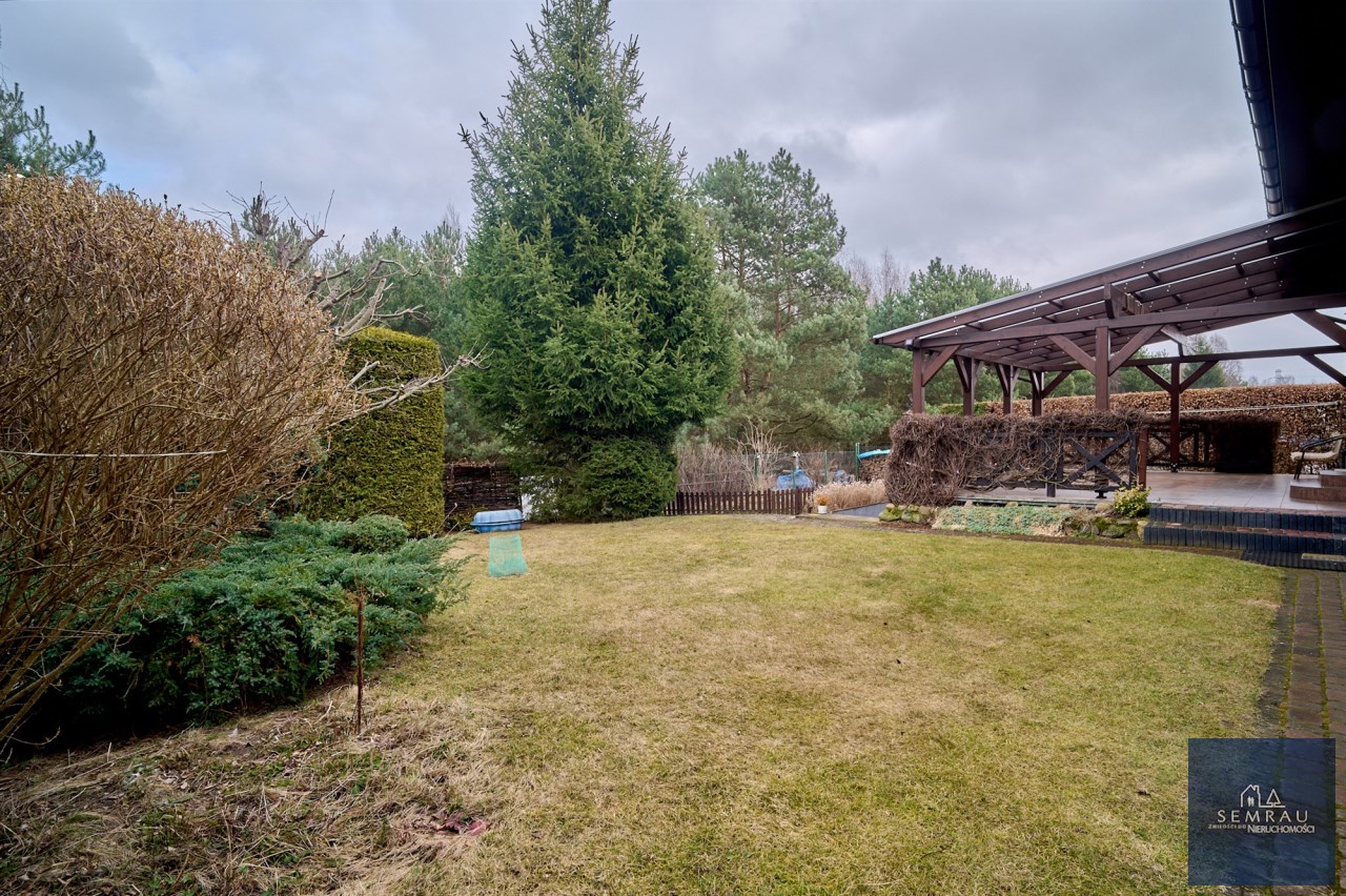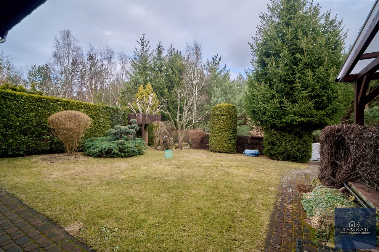 Na szczególną uwagę zasługuje pięknie zagospodarowany ogród – liczne krzewy, drzewa, nasadzenia tui wokół działki, a także drzewka owocowe i ogródek warzywny. Od strony lasu zainstalowano monitoring.