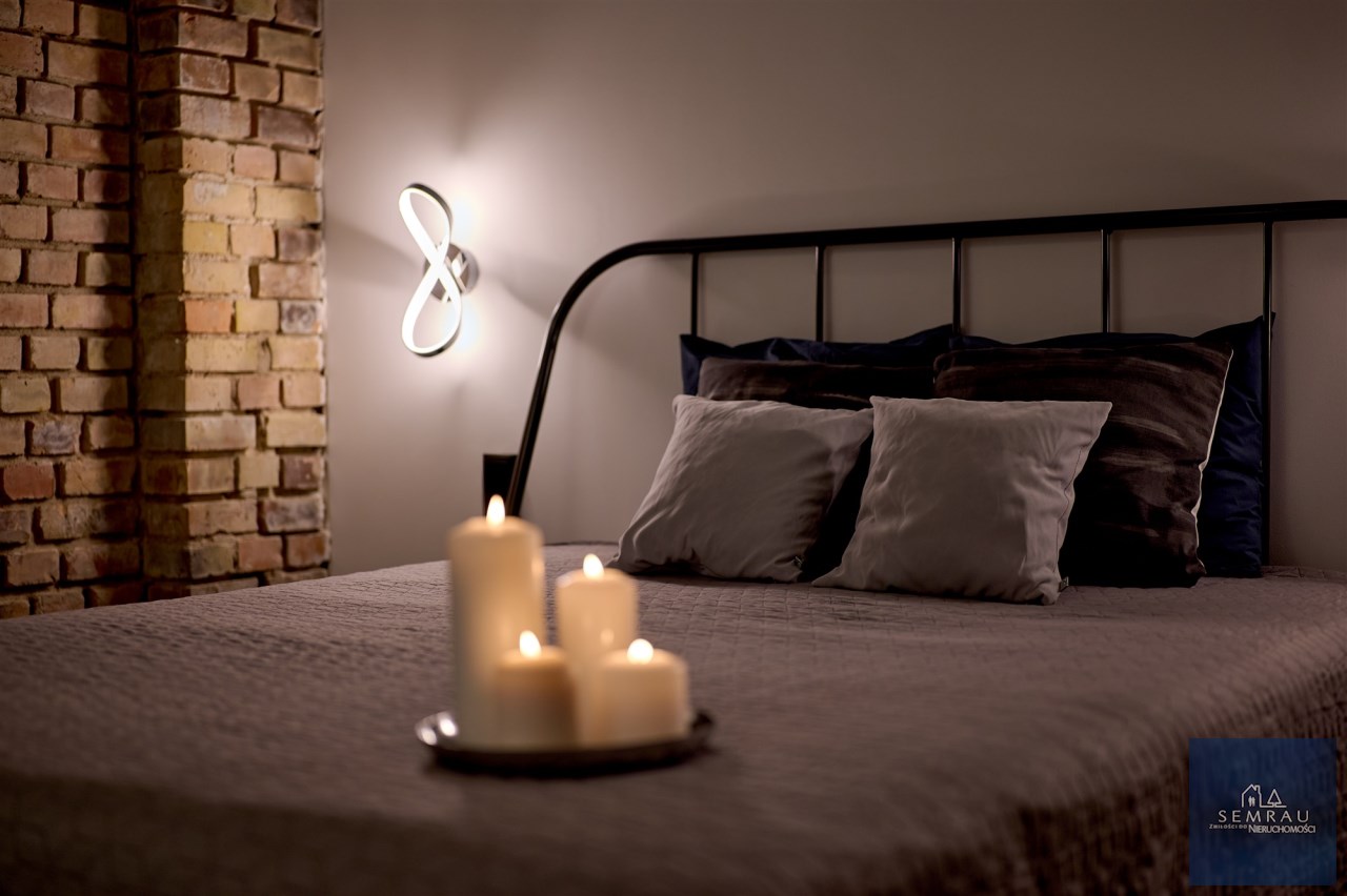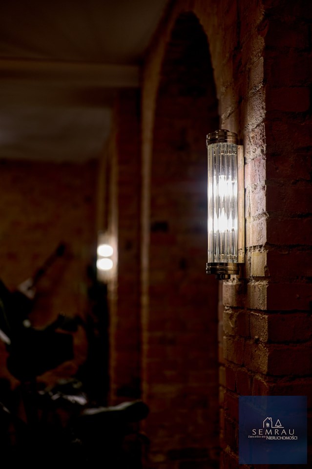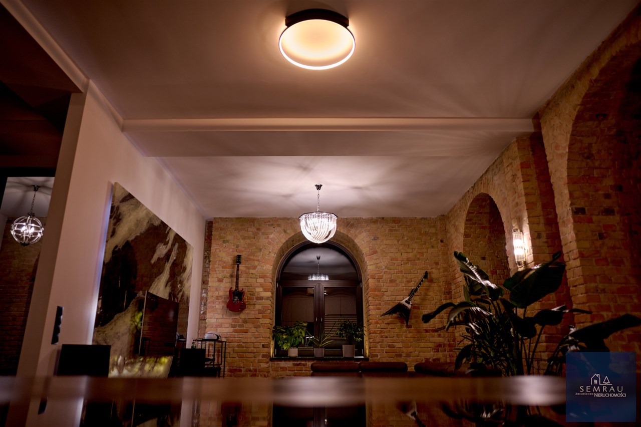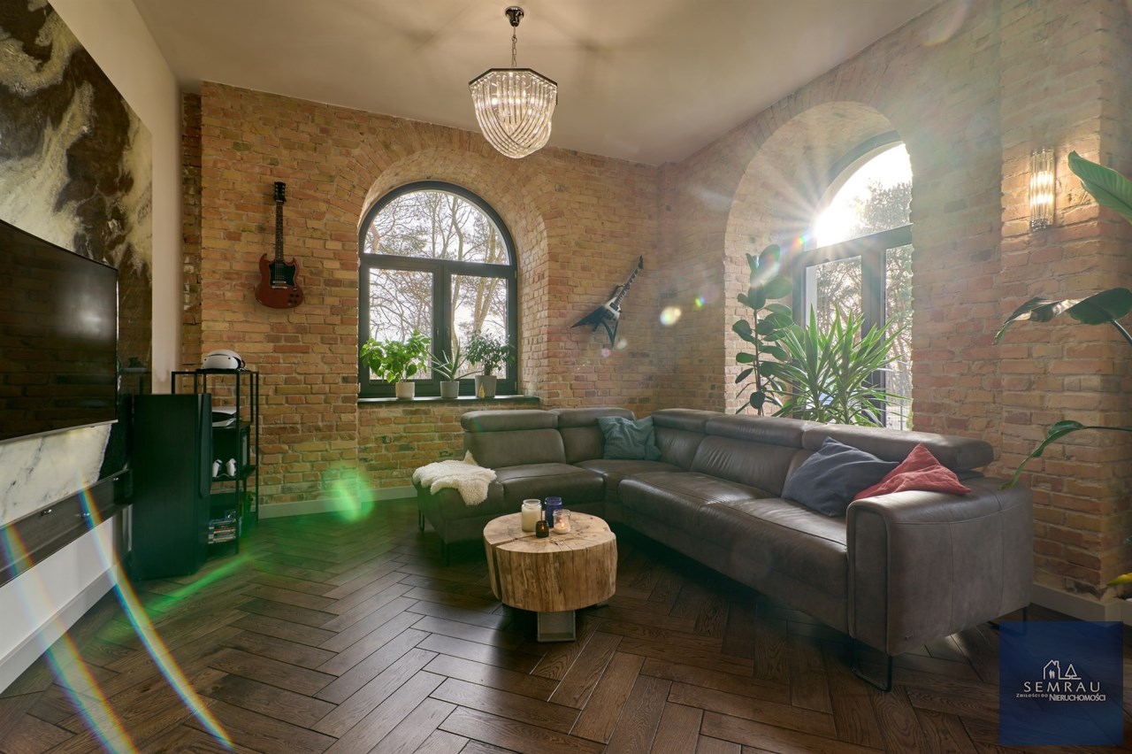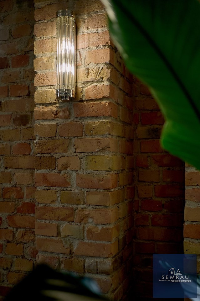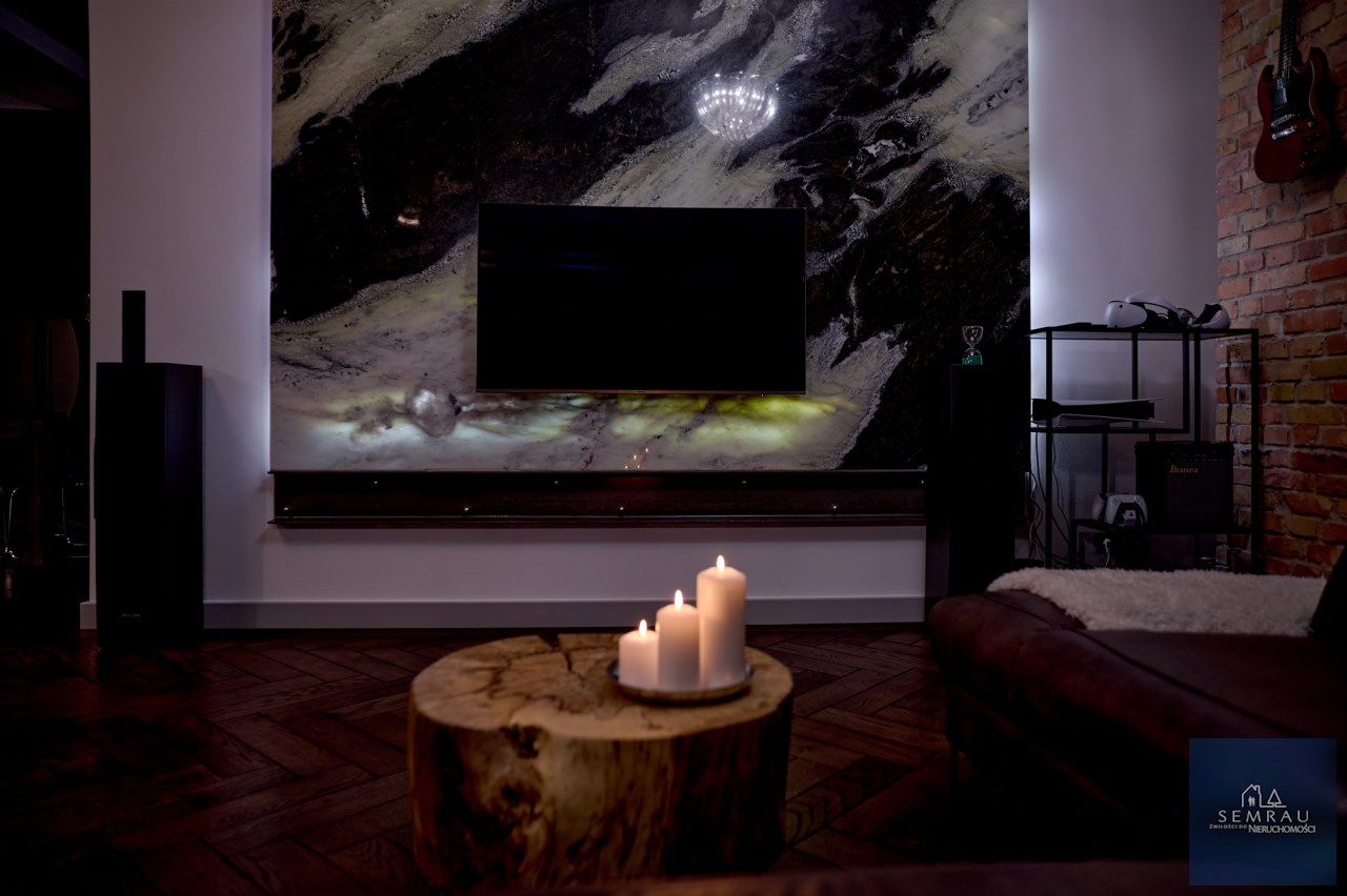 W salonie na ścianie płyta marmurowa Orca z podświetleniem. Ściany w całym mieszkaniu z oryginalnej cegły ceramicznej z lat 30-stych.