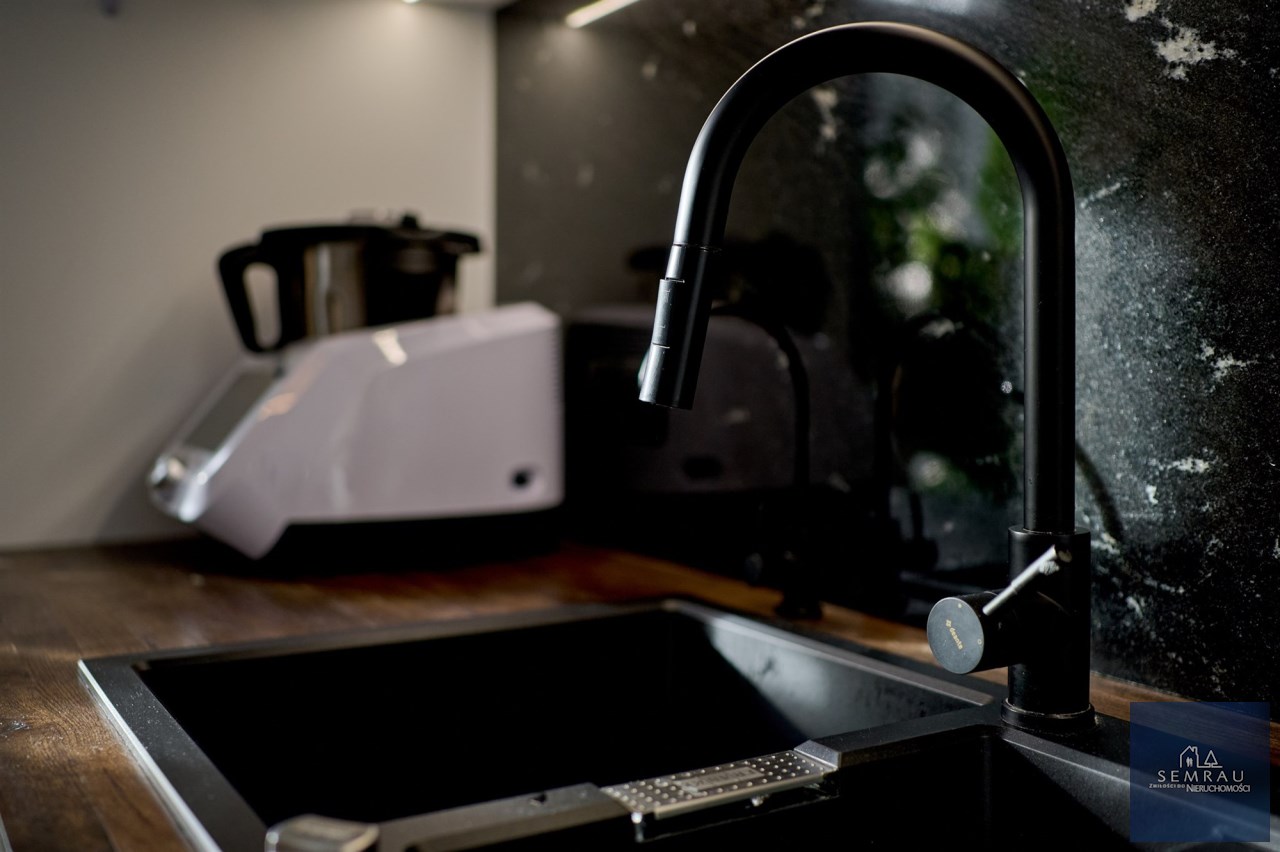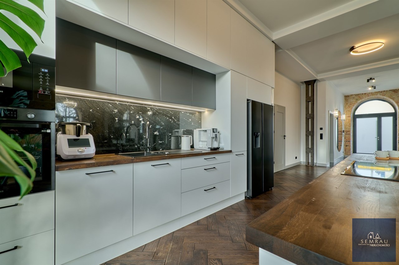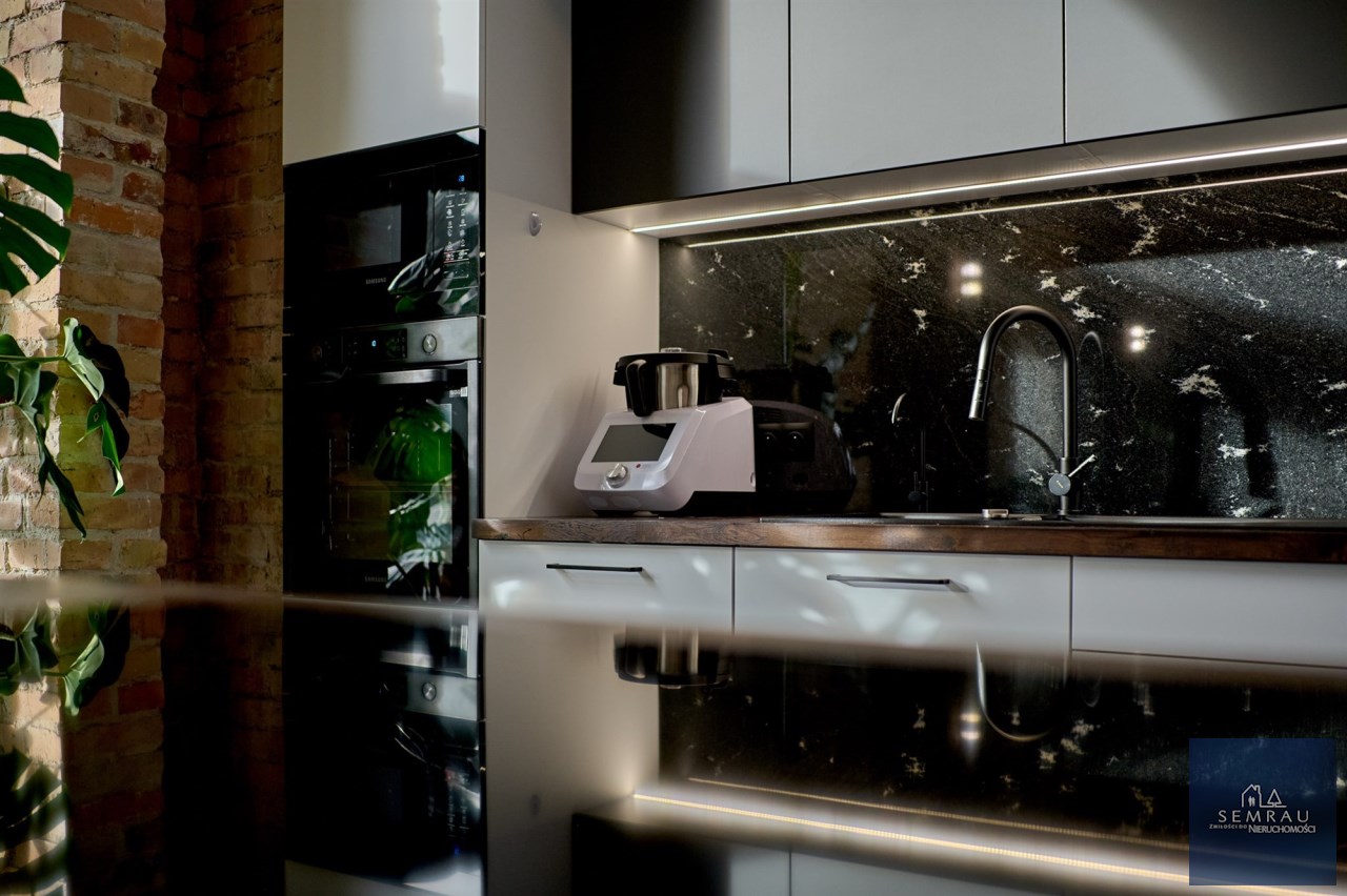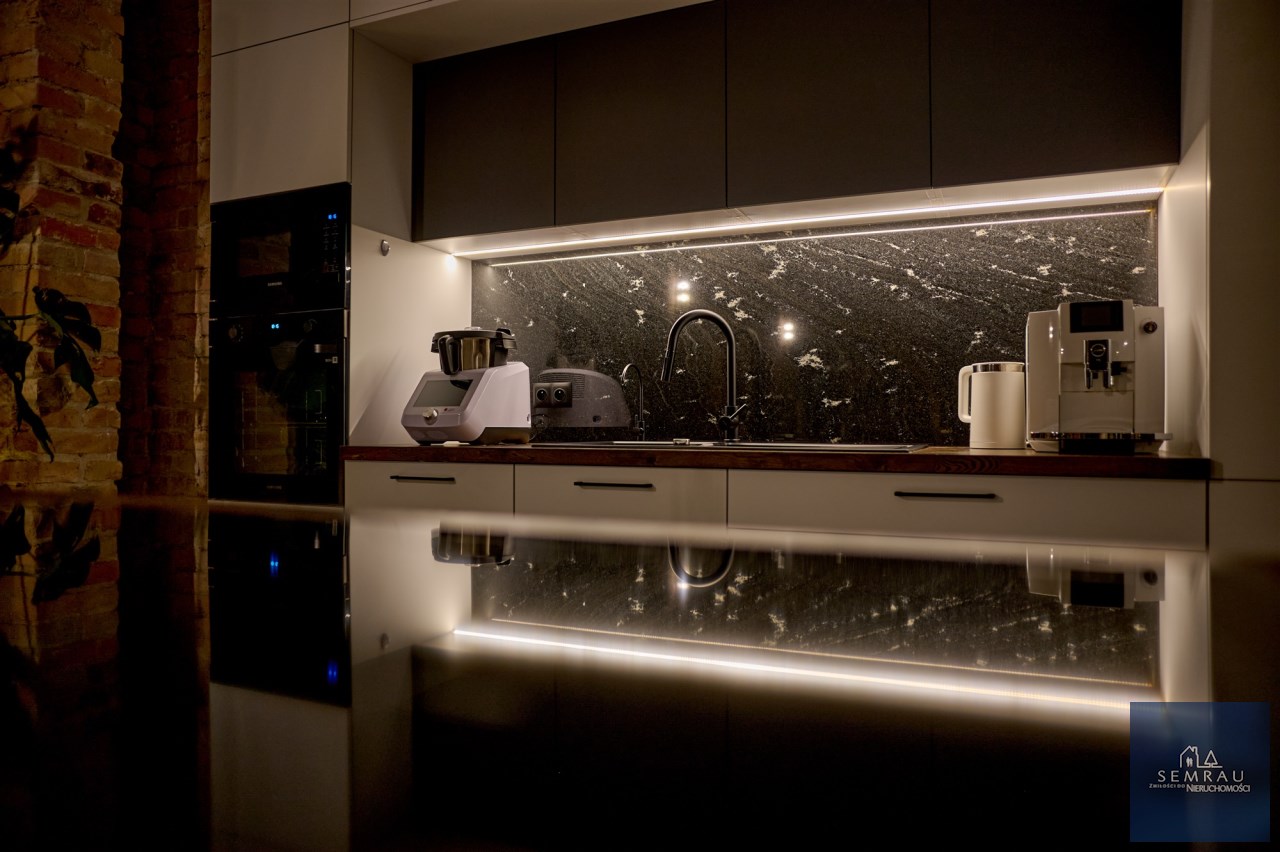 W kuchni sprzęty AGD firmy Samsung (płyta indukcyjna, piekarnik, zmywarka, mikrofalówka oraz lodówka side by side). W kuchni podłączony system odwróconej osmozy z wbudowanym zbiornikiem (5L). Blaty dębowe.