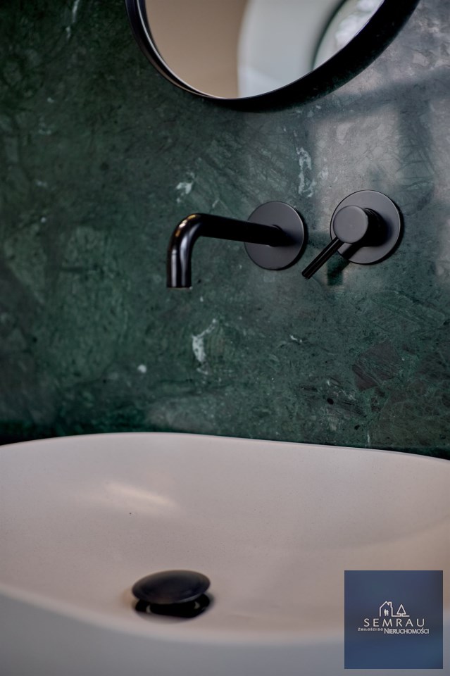 W łazience na ścianie płyta marmurowa Verde Guatemala.