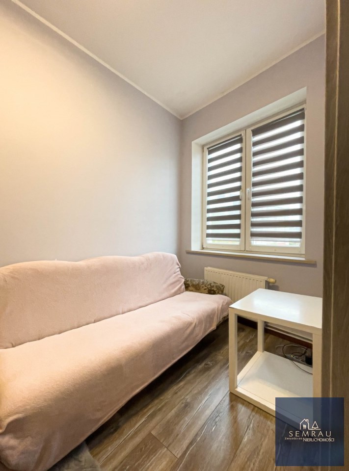 Duży, słoneczny salon (20 m²) z oknami od strony południowej – wnętrze jest bardzo jasne, a niemal całe umeblowanie pozostaje w mieszkaniu.